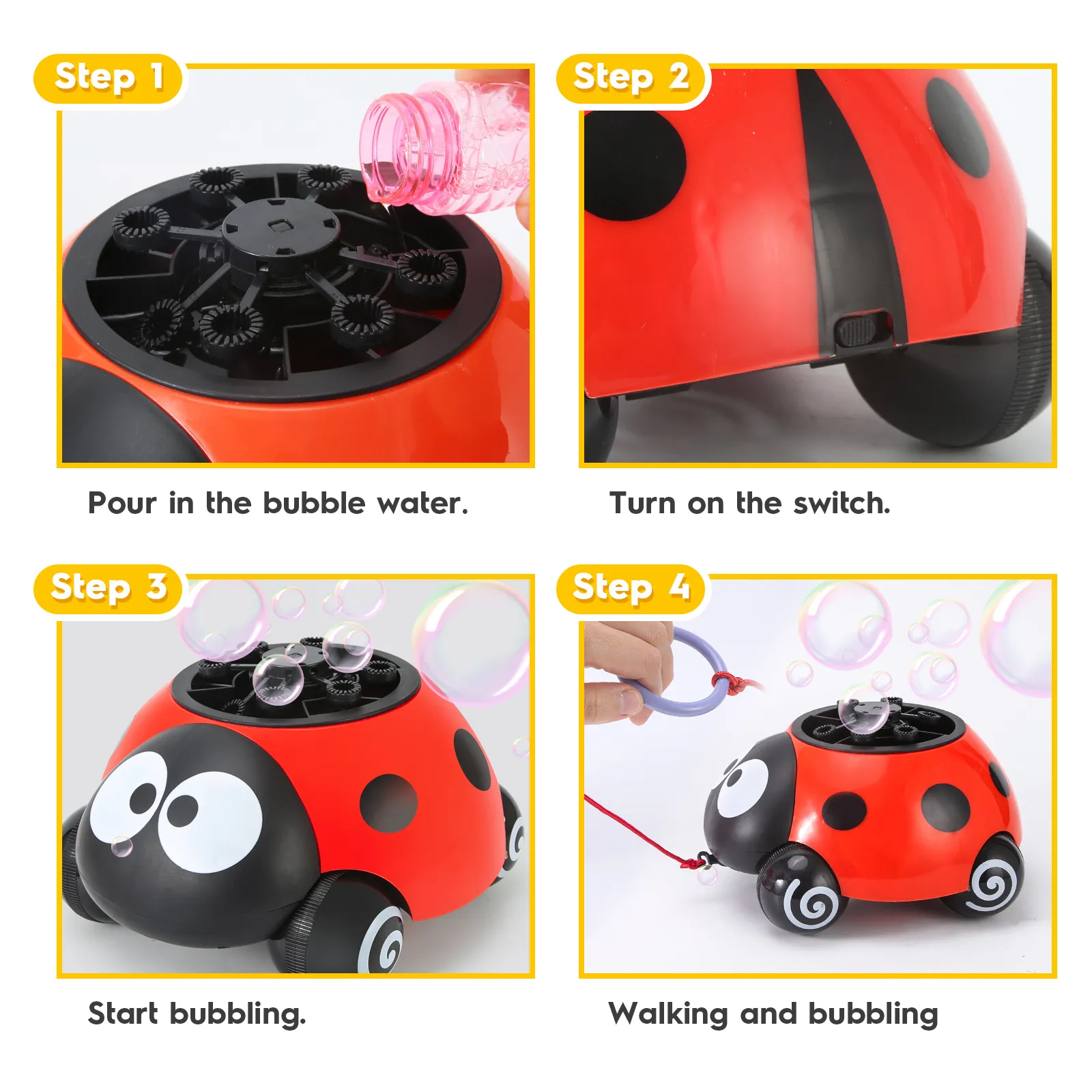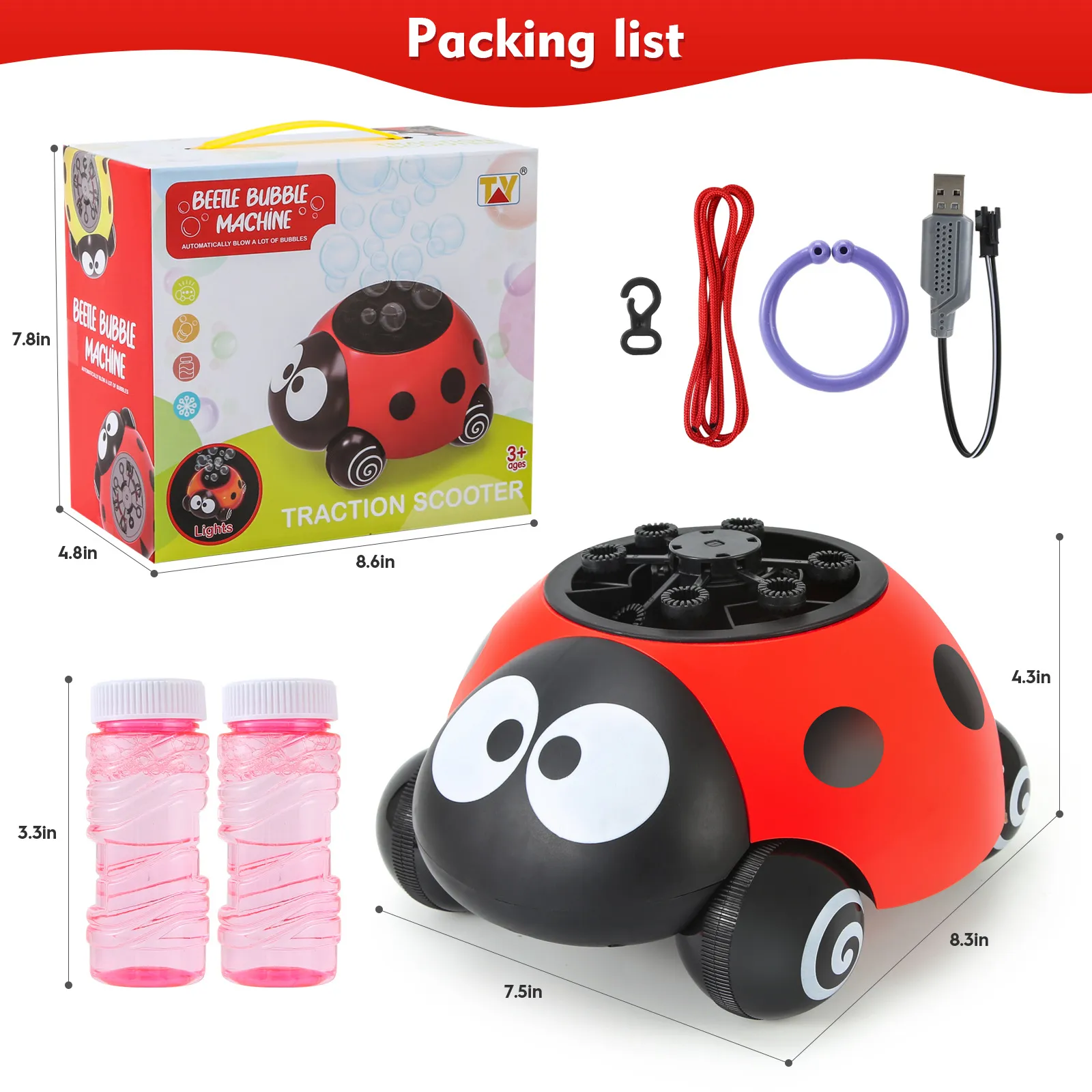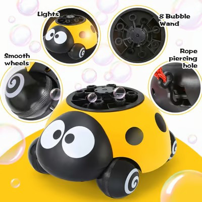 Package includes: 1 ladybug bubble machine, 2 bottles of bubble solution, traction rope, charging cable.