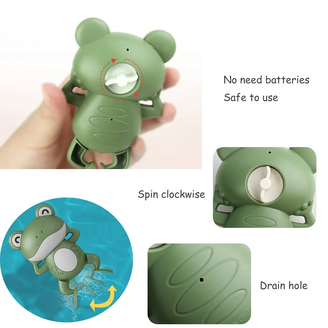 - Easy to Use - Toddler Toys Non-battery. Twist the clockwork under the toy's tummy clockwise and the toys will swim quickly in water around your kids.